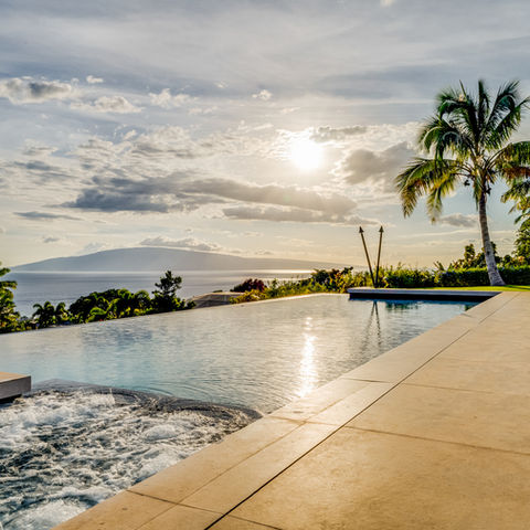 Entering the home, you're greeted by bright, open spaces that frame striking views of the ocean and neighboring islands. The Great Room opens seamlessly to the outdoors through sliding pocket doors, extending the living area to a spacious lanai. A heated pool and jacuzzi await, perfect for unwinding under the warm Hawaiian sun or taking in star-filled night skies.